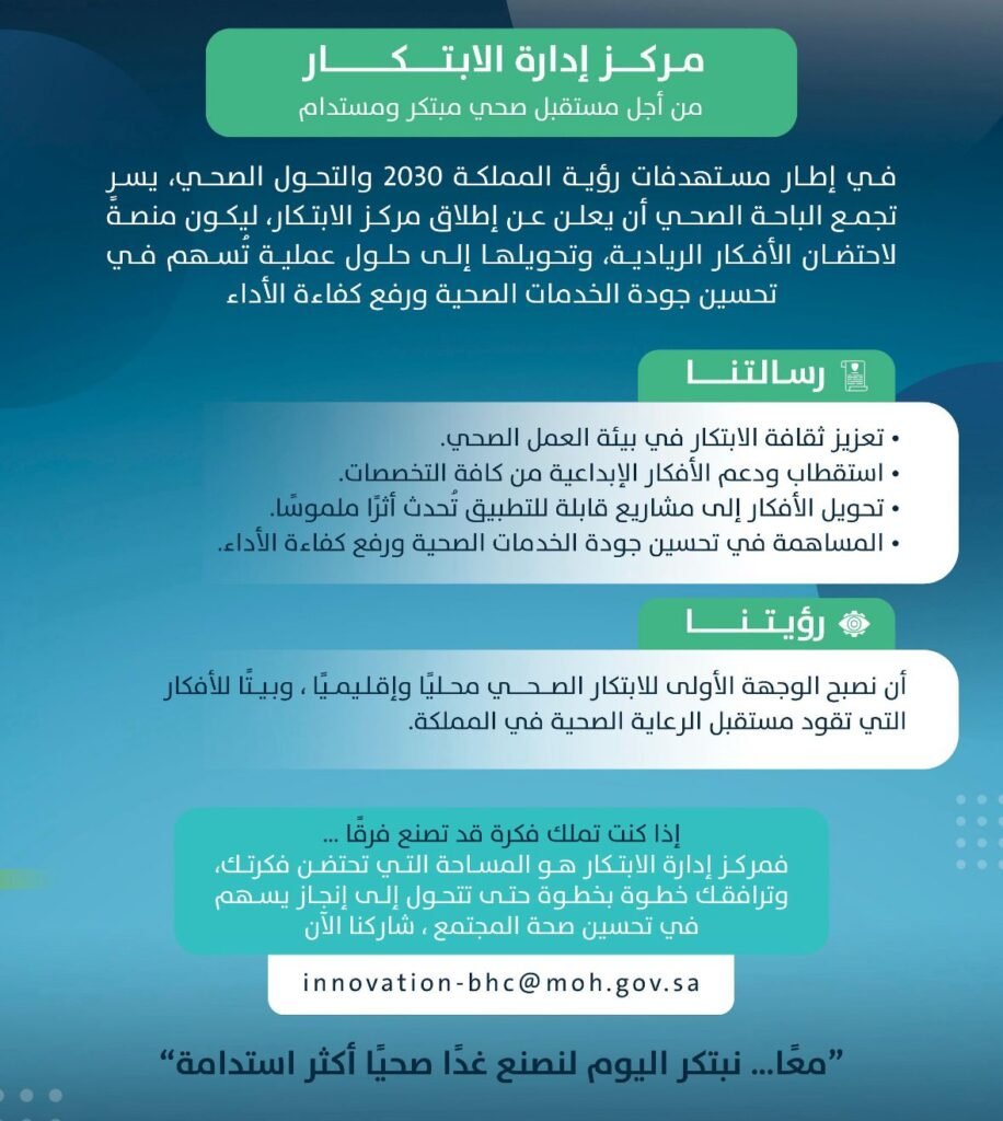 مركز الابتكار بتجمع الباحة الصحي هو منصة تعزز التفكير الإبداعي وتحول الأفكار إلى حلول عملية تسهم في تحسين جودة الخدمات الصحية وتحقيق مستهدفات التحول الوطني ورؤية 2030.